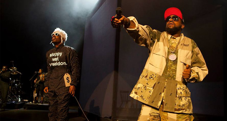 The irony of the Outkast live reunion tour is that Outkast were known more for making flawless studio albums than they ever were for being a dynamite live act. The infrastructure that allows rappers to tour theaters around America was still in its early, reticent days when they were at their peak, and they made most of their duckets recording increasingly popular studio albums. As such, Big Boi—who’s been a road horse since he started releasing solo albums in 2010—is the more road tested of the two, better at pandering to a crowd, better at just staying in the pocket and giving the crowd perfectly recreated versions of their favorite songs. The spotlight comes easier to Andre, though, even if he’s spent the last few years professionally shaving. He wore a body suit that said “SLOPPY WET POSEIDON” and had a tag that said “Sold,” which is a statement that probably only makes sense to him, and rolled around on speakers, cracked meta jokes, and walked around with trumpets between his legs.