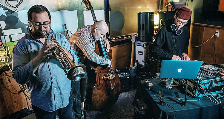 Trumpeter Jaime Breiwick, producer/DJ Ian Carroll, and bassist John Christensen began their first show as KASE with a stop-start approach, patiently threading trumpet melodies and understated rhythms through the chatter of a Saturday night crowd at The Highbury Pub in Bay View. Over the next hour or so, the improvisational trio built up to more aggressive beats and a more enveloping palette of acoustic and electric sounds. They built on the thumping union of Carroll’s drum samples and Christensen’s upright bass, the eerie flow of Breiwick’s sustained trumpet notes over Carroll’s nimble record-scratching, and a balance of sturdy grooves against the subtlety of ambient music.