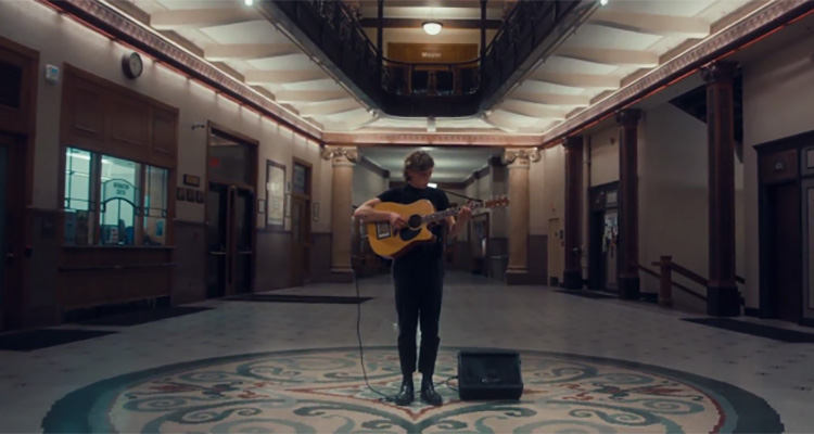 In June, Gerlach and director Damien Blue took to City Hall with a guitar, a camera, and a song. Standing in the otherwise-empty lobby and atrium of the renowned building, King Courteen‘s “Simeon The Petrus” video finds Gerlach’s voice twisting and turning around the space. They selected the civic site on account of its mosaic tile floor and 300-foot-high ceiling that Gerlach says would be an “incredible environment,” both visually and acoustically.