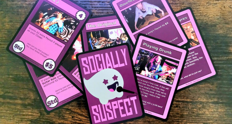 One area where Socially Suspect won’t be bending the rules, however, is its card game. Yep, that’s right: Socially Suspect made its own card game! Socially Suspect: Band Battle is a two-player, 60-card, Munchin-esque game where players experience the glamorous life of a DIY band. “Whichever band ends the night with the most cash wins—usually a pretty realistic $25-$30,” the band explains. “Each song is worth a different amount of money and most have unique effects, while ‘performance cards’ like ‘Mosh Pit’ or ‘Douchey Sound Guy’ can do things like raise or reduce a song’s payout by $1 or cause a band to skip their current song.”