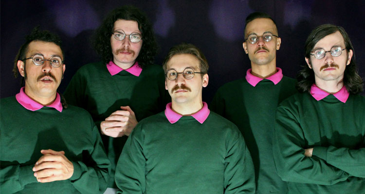Guttural screams and pounding drums provide a soundtrack for the pummeling of an inflatable donut as green sweaters and round glasses blur across the stage.
