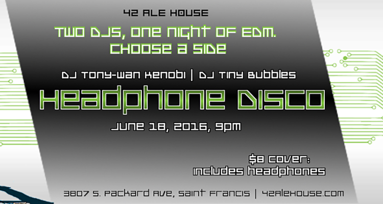 If all goes right Saturday night, as many as 100 people will be dancing in the bar’s patio as two DJs vie for their attention with competing EDM, techno, and deep house mixes, and nobody outside Ale House’s walls will hear a thing. Headphone Disco started as a fun and unique event, but following recent restrictions imposed upon Ale House and having a permit to allow a band to perform last weekend’s Made In Nerdwaukee event denied by the city of St. Francis, it has also become something of a silent protest.