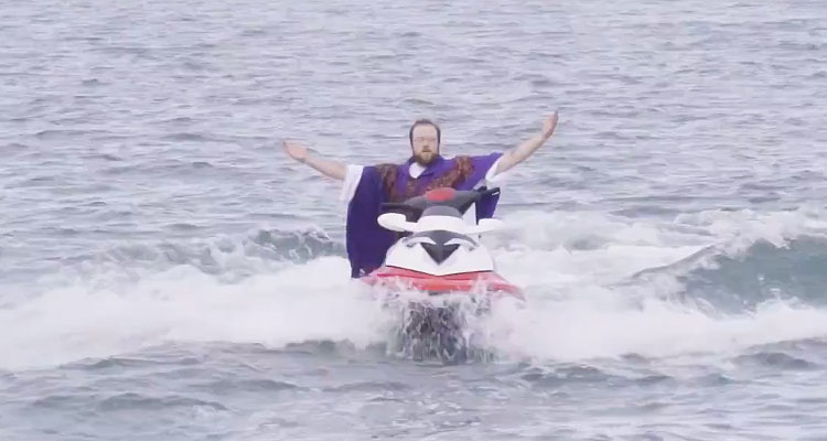 Speeeeaking of Jesus, Dad is looking awfully Christ-like in his latest video, “Holy Water.” It’s the kind of clip (directed by Cellar Dweller, a.k.a. Brian Jude and Matt Bordman) that makes good old fashioned blasphemy fun again: There’s Dad, resplendent in flowing robes, walking on water. There’s Dad again, still decked out in those robes, taking a Jet Ski for a spin. There’s Dad, baptizing his followers not long after dropping lines like “I’m damp, I’m dripping, I’m soaking” There’s also a dolphin sound effect.