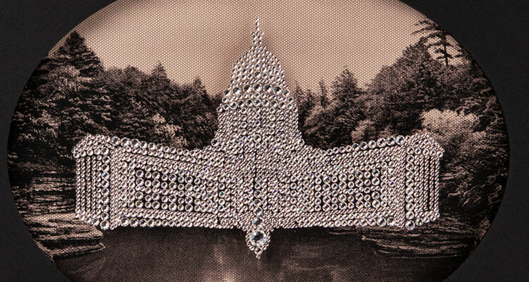 The exhibition, titled Capitol V, draws focus to the negotiation of power between women’s bodies and state governments across our country. The exhibition features portraits of all 50 state capitol buildings as well as the capitol buildings of six inhabited US territories, each made completely out of Swarovski Crystal. Each capitol is framed in a layered shadow box, so the crystal used in personal adornment of the mons pubis, or vajazzle, appears to float over a “virgin” landscape. The portraits are scaled to one-tenth the height of the actual capitol buildings. Each artwork holds between 150 to 2,800 crystals, bringing nearly 60,000 crystals to the exhibition space.