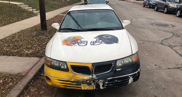 Last year, we told you about a Milwaukee resident who decided to transform their Chevrolet Malibu LS into a full-fledged Chicago Bearsmobile with decals, a navy and orange paint job, and even a “PAYTON” license plate. More than a year later, that car’s parking spot on a Kinnickinnic Ave.-adjacent side street is now occupied by a beaten up Pontiac Bonneville that honors both the Bears and their longtime rival, the Green Bay Packers.