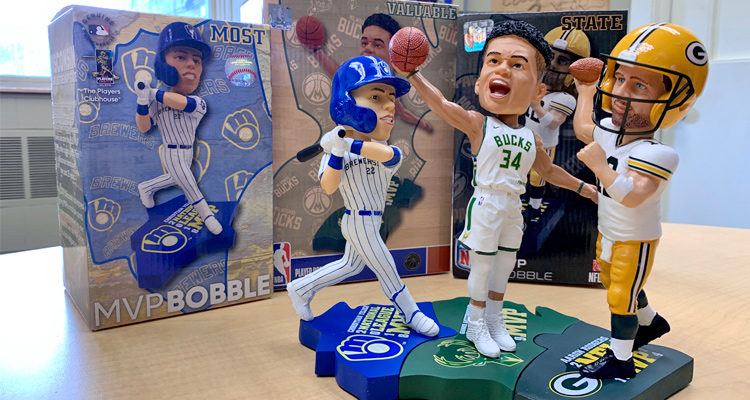 In Fear And Loathing In Las Vegas, Hunter S. Thompson wrote, “Once you get locked into a serious drug collection, the tendency is to push it as far as you can.” In Milwaukee, that tendency also holds true for bobbleheads. Why make, say, single bobbleheads of Wisconsin MVPs Giannis Antetokounmpo, Christian Yelich, or Aaron Rodgers when you can make an interlocking Giannis/Yelich/Rodgers bobblehead puzzle set? And why not have that bobblehead puzzle set form the shape of the state of Wisconsin? And why not trick the whole thing out with some augmented reality bells and whistles? And why not release it the same week that all three superstars are celebrating their birthdays?
