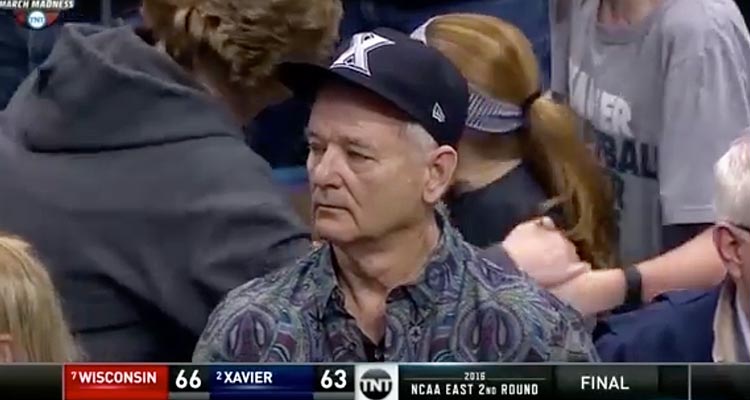 March Madness continued to dole out the upsets Sunday night when No. 7 Wisconsin beat No. 2 Xavier via a last-second three-point shot from Bronson Koenig. The state rejoiced as the Badgers advanced to the Sweet Sixteen, though one member of the crowd wasn’t as thrilled: Bill Murray. The actor/national treasure was at the game rooting for Xavier (Murray’s son is an assistant coach for the team), and appeared speechless and crushed as Wisconsin celebrated its improbable victory. It’s a defeated look Murray hasn’t sported since he was slimed in the hallways of the Sedgewick Hotel.
