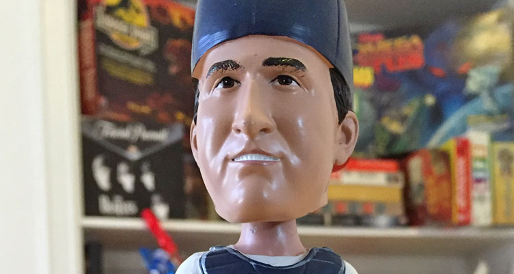 Miller Park is home to not one, but two Bob Uecker statues. A bronze visage stands outside the stadium, while a reclining Ueck can be found in the last row of section 422 in the upper deck. The 2015 Last Row Bobblehead pays tribute to the second of those statues—which, in turn, pays tribute to Uecker’s “I must be in the front row!” ads from the ’70s and ’80s. The Talking Harry Doyle Bobblehead, meanwhile, was a special, 4,000-run giveaway at 2015’s “Major League Night.” (That’s all they made? Four-thousand goddamn bobbleheads?)