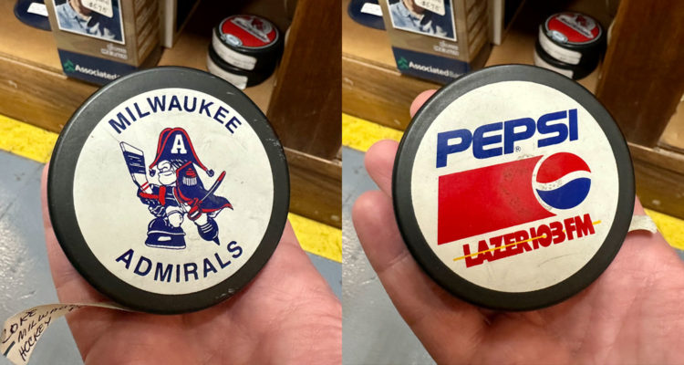 Marvel claims that Infinity War is the most ambitious crossover event in history, but may we suggest an alternative? Feast your eyes, hockey and hard rock fans, on this Milwaukee Admirals / Lazer 103 promotional hockey puck. Sponsored by Pepsi. From 1995. We think.