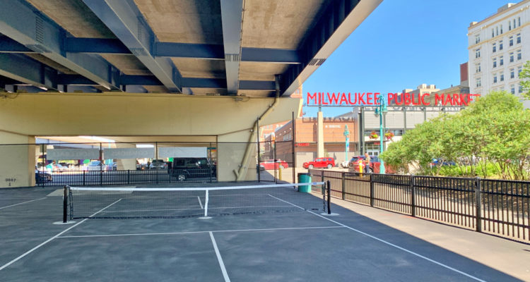Yes, over the weekend, the Riverwalk Commons Pickleball courts sprung up across the street from the Milwaukee Public Market. (You know, under the freeway and alongside the Milwaukee River and the Riverwalk.) Fans of the delightful tennis/ping-ping/badminton hybrid will find two publicly accessible courts at the site, open daily from dawn until 12 a.m. The courts were installed by the Milwaukee Public Market, and are managed by the Milwaukee Business Improvement District #2.